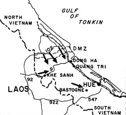 Od zachodu 312 Dywizja, w tym pułk pancerny, wyruszyła z Laosu autostradą nr 9, mijając Khe Sanh i wkraczając do doliny rzeki Quảng Trị. Co znamienne, wywiad aliancki nie przewidział ani skali ofensywy, ani metody ataku, dając komunistom „nieocenioną korzyść w postaci efektu zaskoczenia, kluczową przewagę psychologiczną nad obrońcami, którzy spodziewali się czegoś zupełnie innego”[22].