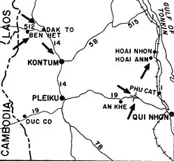 Przeciwko nim w II Korpusie stacjonowały 22. i 23 Dywizja ARW, dwa szwadrony kawalerii pancernej i 2 Brygada Powietrznodesantowa, wszystkie pod dowództwem gen. por. Ngô Du. Już w styczniu stało się jasne, że Wietnam Północny przygotowuje się do operacji ofensywnych na trzech kierunkach i przeprowadzono liczne ataki B-52 w tym rejonie w nadziei na spowolnienie narastania. Siły ARW zostały również przeniesione w kierunku granicy, aby spowolnić postęp komunistów i umożliwić zastosowanie sił powietrznych w celu wyczerpania siły ludzkiej i logistyki Wietnamu Północnego[67]. Ofensywa Bình Định wprawiła jednak generała Du w panikę i niemal przekonała go do nabrania się na sztuczkę Wietnamu Północnego oraz odwrócenia swoich sił od płaskowyżu.