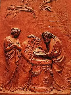 Po prawej stronie widać postać kapłana składającego ofiarę nad ogniem, aby przywołać Westę, opiekuńczą boginię rodziny i ogniska domowego w mitologii rzymskiej. Ma na sobie szaty w ziemistożółtym kolorze, a na jego twarz pada blask ołtarzowego ognia. Może być identyfikowany jako najwyższy kapłan – pontifex maximus, do którego obowiązków należała opieka nad westalkami oraz nauczanie rytuału[7]. Towarzyszą mu trzy westalki, kapłanki odpowiedzialne za podtrzymywanie wiecznego ognia w świątyniach bogini. Stojąca po lewej stronie i ubrana na biało dziewczyna jest inicjowana do służby bogini, co oznacza, że musi pozostawać dziewicą przez trzydzieści lat. Spogląda w ogień i na pustą paterę symbolizującą jej ślub czystości[5]. Według innej interpretacji ta kobieta to bogini Westa przywołana w rytuale ognia, a nie westalka. Została przedstawiona na pierwszym planie, w dostojny sposób, a jej wygląd i strój różni się od kobiecych postaci w tle, które faktycznie są westalkami. Mają na sobie charakterystyczny strój z białej wełny używany w czasie rytuałów, ponadto liczba westalek zawsze była parzysta[6]. Postaci znajdują się na świeżym powietrzu, w ich tle widać strukturę inspirowaną piramidą Cestiusza[5]. Nie jest to tradycyjne przedstawienie tematu; na rzymskich monetach pojawia się mała świątynia Westy, a nie pejzaż z piramidą w tle[7].
