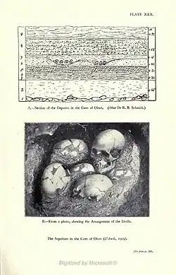 W jaskini znaleziono trzy warstwy kulturowe górnego paleolitu z narzędziami kamiennymi (warstwy od dołu: kultury oryniackiej, kultury solutrejskiej i kultury magdaleńskiej) i szczątkami kostnymi różnych dzikich ssaków (w tym mamuta, konia, lwa jaskiniowego, niedźwiedzia jaskiniowego). W najwyższej warstwie, mezolitycznej, odsłonięto dwie jamy grobowe wysypane ochrą i wypełnione samymi czaszkami ludzkimi (z kręgami szyjnymi), głównie kobiecych i dziecięcych. Ułożone były twarzami na zachód. W jednej było 27 czaszek, a w drugiej 6. Czaszkom towarzyszyły ozdoby wykonane z muszli i zwierzęcych zębów.