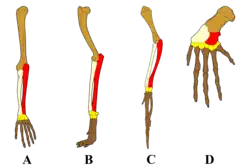 - zeugopodium – dwie kości „przedramienia” (kości promieniowa i łokciowa) lub „podudzia” (kości piszczelowa i strzałkowa)[b]