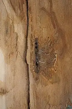 Ogłodek wywodzi się pod korą. Żerowiskiem jest chodnik macierzysty pojedynczy, jednoramienny, podłużny, często rozpoczynający się hakowatym wygięciem. Długość chodnika wynosi do 10 cm i szerokość 3–4,5 mm. W chodniku macierzystym znajdują się liczne otwory wentylacyjne. Chodniki larwalne do 60 sztuk, ułożone szeregowo, gęsto obok siebie, długości do 25 cm i często faliste, naruszające biel drewna, a zakończone kolebkami poczwarkowymi zagłębionymi w korze.
