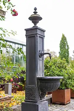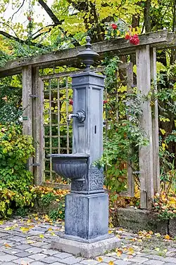 - żeliwna fontanna z 1900 roku przeniesiona do ogrodu w 1983 z terenów augsburskiego Plärrer,