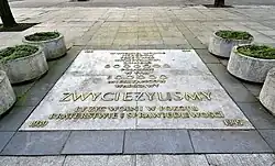 - Płyta upamiętniająca 6 mln Polaków, w tym 800 tys. mieszkańców Warszawy, poległych w II wojnie światowej (odsłonięta 7 maja 1965)[31]