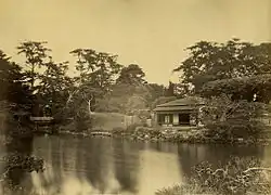 Pod koniec okresu siogunatu na terenie ogrodów rozpoczęto budowę ośrodka szkolenia marynarki wojennej, ale nie zdołano go ukończyć w wyniku upadku siogunatu i generalnej reformy państwa w postaci restauracji Meiji. W 1869 roku budynek przejęło Ministerstwo Spraw Zagranicznych, które ukończyło budowlę, tworząc pierwszą w Japonii rezydencję dla prominentnych gości zagranicznych o nazwie Enryōkan (zlikwidowany w 1889 r.)[a]. Jeszcze tego samego roku gościł w nim pierwszy europejski książę, Alfred, książę Edynburga (1844–1900)[3][4].