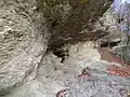 Pomiędzy półką a okapem, mniej więcej w połowie jego długości, w skale znajduje się otwór, od którego w głąb skały prowadzi ciasny i meandrujący tunelik z denną rynną. Półka w jego pobliżu przecięta jest pionową, krętą i rozszerzająca się ku dołowi szczeliną dochodzącą do podstawy skały[1].