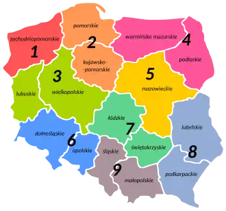 Historyczny, już nie obowiązujący podział obszaru Rzeczypospolitej Polskiej na dziewięć okręgów wywoławczych, obejmujących następujące województwa: