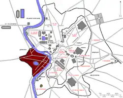 Okręg XIV obejmował Wyspę Tyberyjską oraz tereny za Tybrem, stąd jego nazwa (pol. Zatybrze). W tym okręgu znajdowała się Naumachia Augusta. Granice okręgu od zachodu wyznaczały mury aureliańskie, od wschodu zaś Tyber.