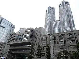 - ↑ Siedziba władz Tokio jest kompleksem składającym się z trzech struktur. Wszystkie trzy są połączone przejściami dla pieszych. Budynek nr 1 jest najwyższy. Główna konstrukcja ma wysokość trzydziestu czterech pięter, ale jej bliźniacze wieże mają czterdzieści osiem pięter. Konstrukcja budynku nr 2 składa się z trzech połączonych wież o różnej wysokości, z których najwyższa ma trzydzieści cztery kondygnacje. Trzecim, półokrągłym budynkiem kompleksu jest siedziba Zgromadzenia, sala posiedzeń radnych. Ma osiem kondygnacji, znajduje się u podnóża budynku nr 1.