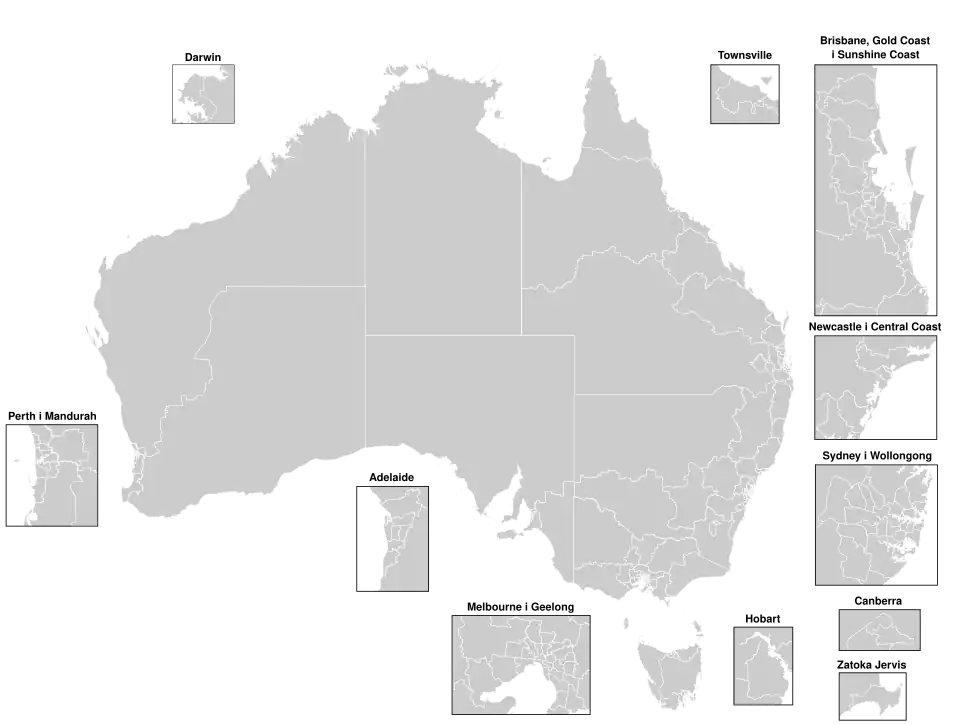 Wszystkie poniższe mapy pokazują podział Australii na federalne okręgi wyborcze, według stanu z dnia wyborów w 2010 roku.