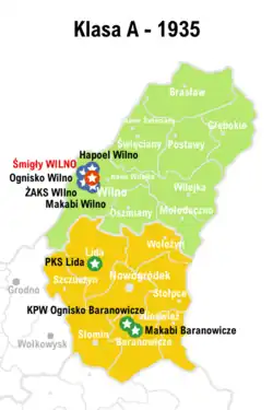 | Okręgowe | II poziom ligowy | Klasa A (Wileńska) | Klasa A (Baranowicka) | ||