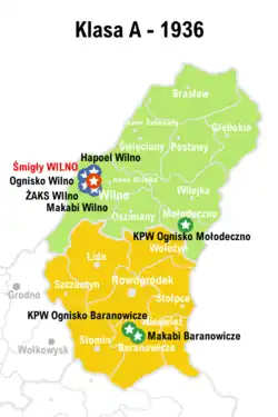 | Okręgowe | II poziom ligowy | Klasa A (Wileńska) | Klasa A (Baranowicka) | ||