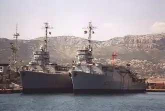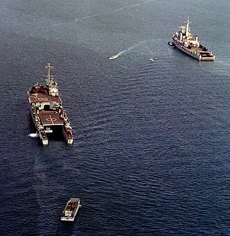![]() „Ouragan” w trakcie dokowania, na drugim planie brytyjski okręt desantowy-dok HMS „Intrepid”, 1990 | |
