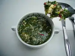 - Klasyczna okroszka z wołowiną. Obok śmietana, specjalny sos (ubite żółtka, rosyjska musztarda, chrzan, zielona cebulka, sól) oraz kwas chlebowy.