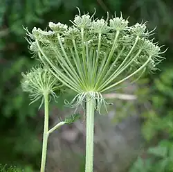 - Zebrane w baldaszki, które w dużej liczbie (do 40) tworzą baldachy złożone o owłosionych szypułach. Pokrywy składają się z wielu, równowąsko lancetowatych i owłosionych listków. Pokrywki także są liczne, mają kształt równowąsko szydlasty i także są owłosione. Płatki korony są kolisto jajowate, białe, rzadziej czerwonawe, osiągają do 1 mm długości. Kielich z wyraźnymi, szydłowatymi działkami, które jednak z czasem odpadają. Słupek pokryty sztywnymi włoskami[6].