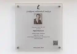 Tablica pamiątkowa na ogrodzeniu domu przy ul. Rybińskiego 3 w Warszawie, w którym mieszkał, odsłonięta w 2016 roku[4].