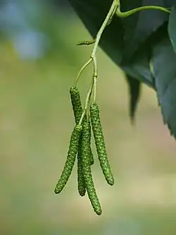 - Kwiaty męskie w postaci zwisających kotek, w kolorze żółtobrązowym do 7 cm długości. Kwiaty żeńskie krótkie, zielonkawe[6].