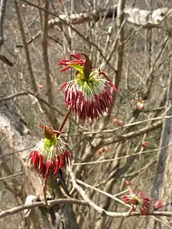 - Zebrane w kwiatostany pojawiające się przed rozwinięciem liści. Skupienia tworzy 6–12 kwiatów wyrastających z kątów podsadek. Kwiaty są obupłciowe, pozbawione okwiatu. Pręcików jest 6–19 i rozwijają się one przed słupkiem (kwiaty są przedprątne). Owocolistki w liczbie 8–31, wolne, z 1–3 zalążkami. Na szczycie z znamieniem silnie podzielonym na podobieństwo szczoteczki do zębów[6][2].