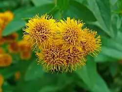 - Zebrane w koszyczki o średnicy ok. 1 cm, te z kolei w liczbie ok. 5–20, czasem nawet 30, w podbaldachowaty kwiatostan złożony. Okrywę koszyczków tworzą owłosione listki o zaostrzonych i odgiętych wierzchołkach, wyrastające w kilku szeregach. Wszystkie kwiaty mają kolor złocistożółty, przy czym brzeżne kwiaty języczkowate mają języczek niewiele dłuższy od kwiatów rurkowatych rozwijających się w środkowej części koszyczka[6].