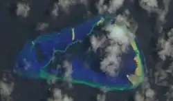 ![]() Fragment obrazu uzyskanego przez satelitę Terra w grudniu 2001; czerwony kolor wskazuje roślinność na wyspie, która ulokowana jest w południowo-wschodniej części One Tree Reef | |