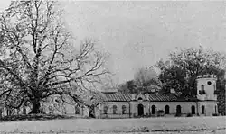 Najprawdopodobniej w pierwszej połowie XIX wieku wybudowano tu siedzibę właścicieli. Był to długi, parterowy, murowany dwór utrzymany w stylu neogotyckim, z ośmioboczną neogotycką wieżą zegarową z prawej strony z balkonikami skierowanymi na cztery strony świata, z kutymi, żelaznymi balustradkami. Dom był przykryty gładkim czterospadowym dachem. Wejście zdobiła zębata attyka.