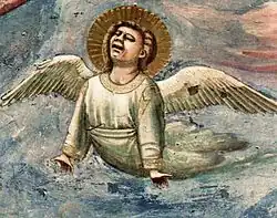 Nad sceną opłakiwania, na niebieskim tle, unoszą się w bezładzie małe aniołki. Zostały przedstawione w znacznym skrócie perspektywicznym co nadaje wrażenie zawieszenia ich w locie. Twarze aniołów przepełnione są cierpieniem a ich gesty mają cechy ludzkie; jeden wyciera łzy własną szatą, drugi rozpościera skrzydła i ramiona czym wyraża swą rozpacz, trzeci wznosi twarz ku niebu wydając krzyk rozpaczy, jeszcze inne zakrywają dłońmi twarz.