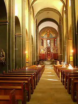 Kościół jest trójnawową dwuchórową bazyliką z jednym transeptem. Korpus nawowy składa się z pięciu prostokątnych przęseł nawy głównej, oraz tyle samo w nawach bocznych, a więc nie zastosowano tutaj charakterystycznego dla ówczesnych budowli sakralnych systemu wiązanego. Zróżnicowano plan zamkniętych półokrągłymi absydami chórów. Chór wschodni jest wydłużony, poprzedzony szerokim transeptem którego oba ramiona są od wschodu zamknięte absydami. Ta część mocno odstępuje od całości bryły. Chór zachodni stanowi jedno przęsło zintegrowane z ramionami transeptu, które nie odstępują poza lico naw bocznych (poza ogrągłymi wieżami zamykającymi transept). Późniejsze, XIII-wieczne atrium składa się z trzech ramion, każde z nich składa się z czterech przęseł. Połączone jest z transeptem zachodnim kościoła, gdzie znajdują się wejścia do wewnątrz.