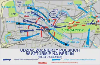 Stanowił on ostatnią już większą naturalną przeszkodę przed umocnioną dzielnicą rządową. Do Kancelarii Rzeszy pozostały niecałe 2 km. W dzielnicy Moabit wojska radzieckie napotkały wyjątkowo twardą obronę[39]. Na północy 2 Gwardyjska Armia Pancerna kontynuowała oczyszczanie Siemensstadt, a 3 Armia Uderzeniowa zbliżała się do Tiergarten i dzielnicy Prenzlauer Berg. Na południowym zachodzie 3 Gwardyjska Armia Pancerna wkroczyła do dzielnic Charlottenburg i Grunewald. Następnego dnia (28 kwietnia), po opanowaniu Gatow, Armia Czerwona od północy rozpoczęła natarcie na Poczdam.