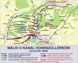 Rankiem 24 kwietnia rozpoczął się silny ostrzał artyleryjski, który poprzedził desant piechoty na łodziach i pontonach. Uchwycono przyczółek, na którym w ciągu kilku godzin saperzy wybudowali mosty potrzebne do przeprawienia czołgów. Po południu maszyny ruszyły na drugi brzeg kanału. Próbowały je powstrzymać 22 czołgi (2 PzKpfw VI Tiger i 20 PzKpfw IV), jakie pozostały gen. Weidlingowi w jego dywizjach grenadierów pancernych. Seria kontrataków przeciwko 5 Armii Uderzeniowej nie przyniosła jednak efektu, przewaga oddziałów marsz. Koniewa była zbyt duża. Niemcy zostali odparci, a ich przeciwnicy do końca dnia zajęli park Teltow i dotarli do obwodowej linii kolei miejskiej S-Bahn[36].