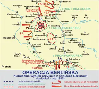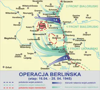 - podczas drugiego etapu operacji, trwającego od 20 do 25 kwietnia, wojska 1 Frontu Białoruskiego i 1 Frontu Ukraińskiego po przekroczeniu Odry rozwijały natarcie w głąb Brandenburgii i Łużyc, okrążyły Berlin i wojska niemieckie w rejonie Gubina i Frankfurtu nad Odrą. W tym czasie oddziały 2 Frontu Białoruskiego po sforsowaniu zachodniego koryta Odry zdobyły Szczecin[21];