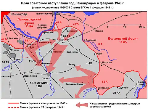 1 lutego 1943 r. Stawka swoją dyrektywą № 30034 rozkazała wojskom frontów Leningradzkiemu i Wołchowskiemu „z uwagi na to że frontalne uderzenia w okręgu Siniawino nie dały dotychczas oczekiwanych rezultatów», nie zaprzestając natarcia armii 67 i 2 Armii Uderzeniowej, wykonać „dodatkowe uderzenia z flank” z celem otoczenia mgińsko-siniawińskiego ugrupowania przeciwnika. Skrzydłowe uderzenia powinna wykonać 54 Armia Front Wołchowski z okręgu Smierdyna w kierunku Waskiny Niwy – Czapki (Leningradzki obwód) i 55 Armia Front Leningradzki z okręgów Iwanowsk i Rożdiestwieno w kierunkach Mga (Kirowski okręg) i Tosno. W końcowym wyniku wojska czterech radzieckich armii, okrążywszy i zniszczywszy mgińsko-siniawińskie ugrupowanie przeciwnika, powinny wyjść na linię Uljanowka (Leningradzki obwód) – Tosno – Lubań