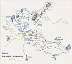 Oddziały polskie odrzuciły też spod samego już miasta nieprzyjaciela działającego od strony Oszmiany. Wreszcie pozostałymi silami odparły natarcie przeciwnika z kierunku Szyrwint[56]. Do 1 maja Polacy odparli wszystkie próby opanowania przez Sowietów Wilna. Potem sami przeszli do natarcia i kolejnymi uderzeniami odrzucili przeciwnika od miasta, zajmując Mejszagołę, Giedrojcie, Podbrodzie i Smorgonie. Tocząc kolejne walki, Grupa Wileńska do połowy maja dotarła do linii: jezioro Narocz-Hoduciszki-lgnalino-Łyngmiany[53][57].