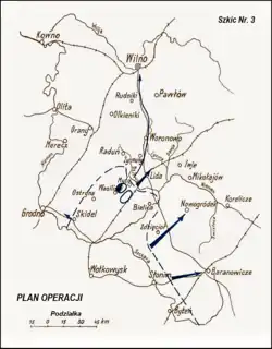 Polskie zgrupowanie uderzeniowe miało skoncentrować się na zachód od Lidy, a jego grupa jazdy miała forsownym marszem podejść pod Wilno i zdecydowanym atakiem zdobyć je. Maszerująca za kawalerią grupa piechoty miała obsadzić miasto i nie dopuścić do jego utraty[11].