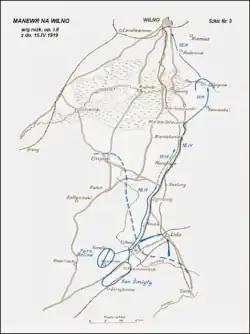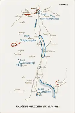 Plan ofensywy przewidywał prowadzenie natarcia na Lidę, Nowogródek i Baranowicze, przy jednoczesnym uderzeniu na Wilno samodzielnie operującej brygady jazdy i dywizji piechoty[19][20]. Plan „wyprawy wileńskiej” utrzymywany był w dużej tajemnicy. Pierwsze szczegółowe rozkazy operacyjne wydane zostały dopiero 10 i 11 kwietnia, zaś wojska przybywające z głębi kraju nie były świadome zadań, jakie będą realizowały. Obok wojsk dowodzonych przez generałów Szeptyckiego i Listowskiego w planowanej operacji miały uczestniczyć dwie dywizje legionowe: 1. i 2 Dywizja Piechoty Legionów zorganizowane i szkolone w głębi kraju[21].