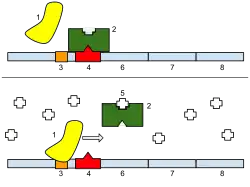 1: Polimeraza RNA, 2: Represor, 3: Promotor, 4: Operator, 5: Laktoza, 6: lacZ, 7: lacY, 8: lacA.