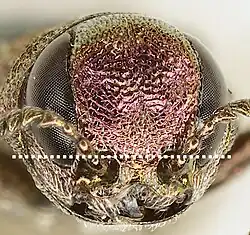 Głowa ma duże oczy, w widoku przednim sięgające dolnymi brzegami poniżej wysokości podstaw czułków[4][5]. Rzeźba nieco słabiej niż u opiętka porzeczkowego sklepionego ciemienia składa się z punktów i podłużnych zmarszczek. Policzki są wąskie, w połowie tak szerokie jak oczy[4].