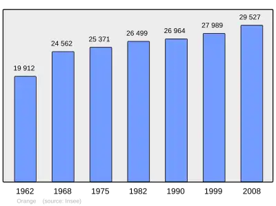 Według danych na rok 2008 gminę zamieszkiwało 29 527 osób, a gęstość zaludnienia wynosiła 363 osoby/km² (wśród 963 gmin regionu Prowansja-Alpy-W. Lazurowe Orange plasuje się na 26. miejscu pod względem liczby ludności, natomiast pod względem powierzchni na miejscu 71.).