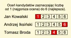 - Wyłonienie zwycięzcy. Wyliczona jest średnia ocen. Zwycięzcą zostaje kandydat o największej średniej (w tabeli na zielono) spośród tych, którzy przeszli próg wyborczy.