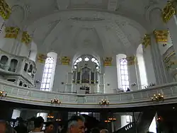 Główne organy w kościele św. Michała mają własną historię. Zostały one zbudowane po pamiętnym pożarze z 1906 roku przez firmę E.F. Walcker. Miały 5 manuałów, pedał, 163 głosy i 12173 piszczałki i były największymi organami kościelnymi na świecie. Przepadły wskutek ciężkich zniszczeń w czasie drugiej wojny światowej.