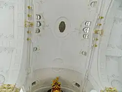 | I. Positiv C–g3 | II. Hauptwerk C– g3 | III.Schellwerk C– g3 | IV. Kronwerk C– g3 | V. Brustwerk C– g3 | Pedal C– g1 |