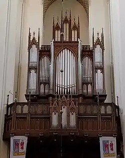 Romantyczne[1][2] organy główne znajdują się na drewnianym chórze muzycznym umiejscowionym nad głównym wejściem w zachodniej części kościoła, między arkadą podwieżową a pierwszą parą filarów nawy głównej[3][4][5]. Zasilane są miechem położonym za instrumentem, we wnęce arkady podwieżowej[3]. Instrument ma 32 głosy stałe, tworzące razem 40 registrów rozdysponowanych między czterema klawiaturami[6]. Piszczałki ustawione są na wiatrownicach pneumatyczno-stożkowych[1][2][4], które połączone są ze stołem gry trakturą pneumatyczną[1][4]. Stół gry wyposażony jest w trzy manuały oraz pedał[1][2]; znajduje się w przedniej części chóru, w pobliżu balustrady[1][4].
