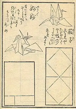 Pierwszą książką o origami była Tsutsumi-no-Ki, opublikowana w 1764 roku. Zawierała ona instrukcje składania noshi i tsutsumi. Natomiast pierwszym podręcznikiem z ilustracjami, traktującym origami jako rozrywkę, były: „Tajniki składania tysiąca żurawi” (Hiden senbazuru orikata), opublikowane w 1797 roku. Pokazano w nich podstawowe instrukcje graficzne sposobów składania różnych form żurawi, japońskiego symbolu szczęścia i długiego życia.