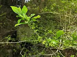 - Sezonowe, skrętoległe, pojedyncze, całobrzegie, ciemnozielone[8][6]. Ogonek liściowy długości 3–8 mm, blaszka liściowa jajowata do eliptycznej, o wymiarach 4–15 × 2–6 cm[5].