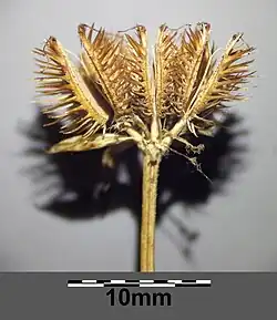 - Brązowe, spłaszczone rozłupki, 5–7 mm długości, poza nagimi żebrami głównymi na żebrach dodatkowych ma rzędy kolców[7][8].