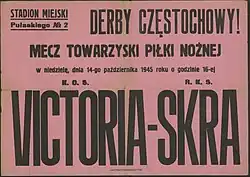 Mecze derbowe przed 1939 rokiem oraz w latach 1945-1968 ściągały na trybuny tysiące kibiców. Wielkie derby miasta miały miejsce w 1950 roku, kiedy Skra i Victoria występowały w II lidze. W pierwszym meczu Skra wygrała 2ː0, w rewanżu Victoria wygrała 1ː0[24]. Duże emocje budziły mecze rozgrywane w latach 1957–1962 pomiędzy Rakowem, Skrą i Victorią (od 1960 także Budowlanymi) w walce o awans do II ligi. Rywalizację tę wygrał ostatecznie Raków.
