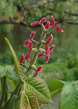 - Kwiaty zebrane są w kwiatostany zwane kotkami. Kwiatostany żeńskie wyprostowane i składają się z 12-20 kwiatów. Kwiaty posiadają czerwone piórka o długości około 1 cm[5].