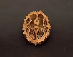 - Kuliste pestkowce średnicy 3–5 cm. Zewnętrzna okrywa zielona, silnie aromatyczna. Owocnia twarda, gruba, bruzdowana i czarnobrązowa. We wrześniu i październiku dojrzałe orzechy spadają z drzewa[6].