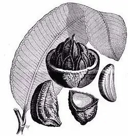 - Kulista lub wydłużona torebka o masie 1–2 kg, okryta brązową, zdrewniałą owocnią zawierająca 18–24 nasion podobnych z kształtu do segmentów pomarańczy. Same trójkanciaste nasiona są pokryte cienką, twardą, zdrewniałą łupiną.