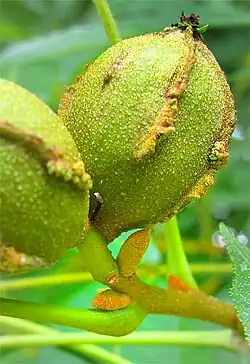 - Małe pestkowce, w zarysie okrągłe o średnicy około 25 mm[12]. Mięsista otoczka pestki jest żółtozielona, po dojrzeniu owoców od szczytu do około połowy długości owocu rozdziela się na cztery łatki[11]. Nasiona otoczone cienkim zdrewniałym endokarpem, są czerwono-brązowe, jadalne, lecz mają gorzki smak[6] i jako jedyne z orzeszników są unikane przez wiewiórki[10].