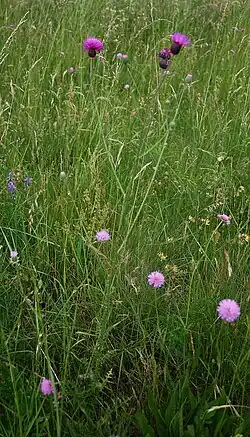 - Purpurowe, zebrane w koszyczki. Na każdej gałązce występuje jeden tylko koszyczek. Okrywa koszyczka długości 15–20 mm. Jej łuski są wąskie, nie odgięte, w nasadzie mają szerokość około 1 mm, a szczyty stopniowo zaostrzone.